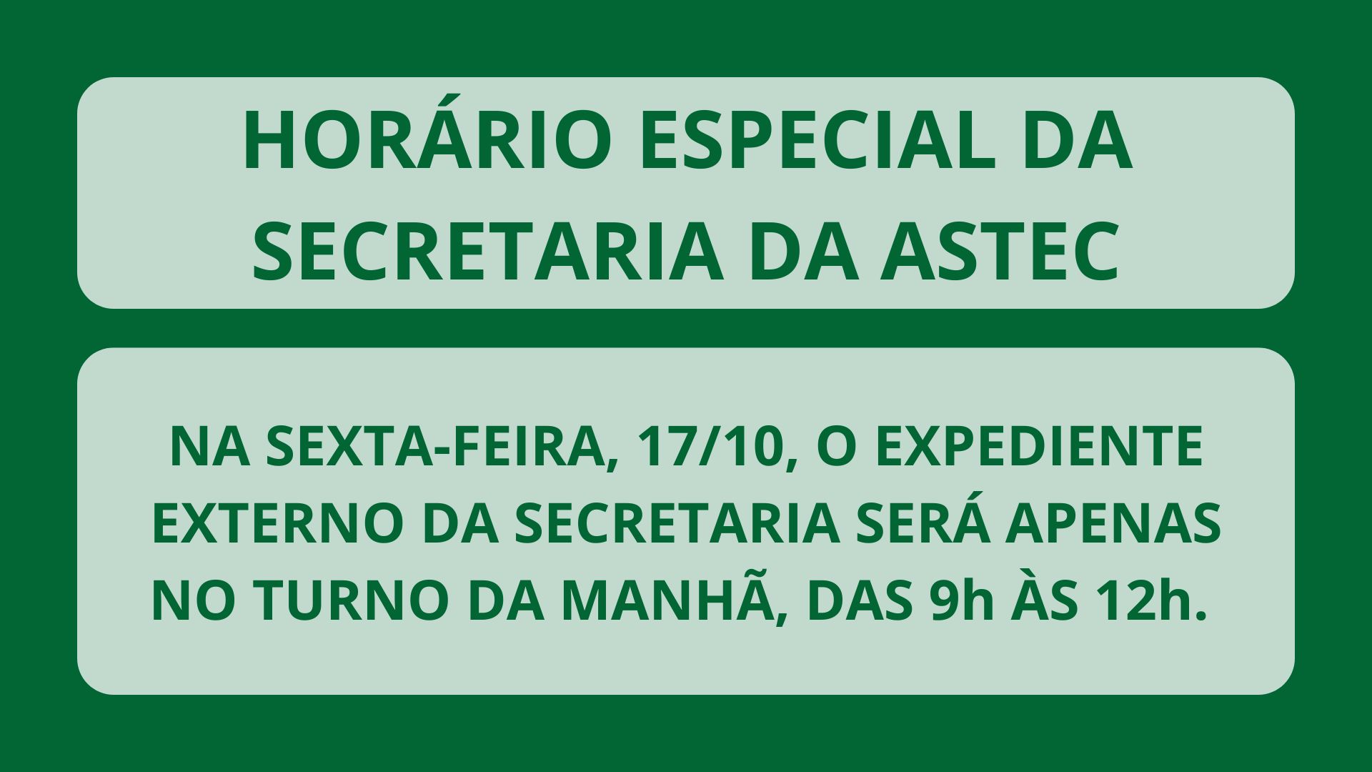Na sexta-feira, 17/10, o expediente externo da secretaria será apenas no turno da manhã, das 9h às 12h.