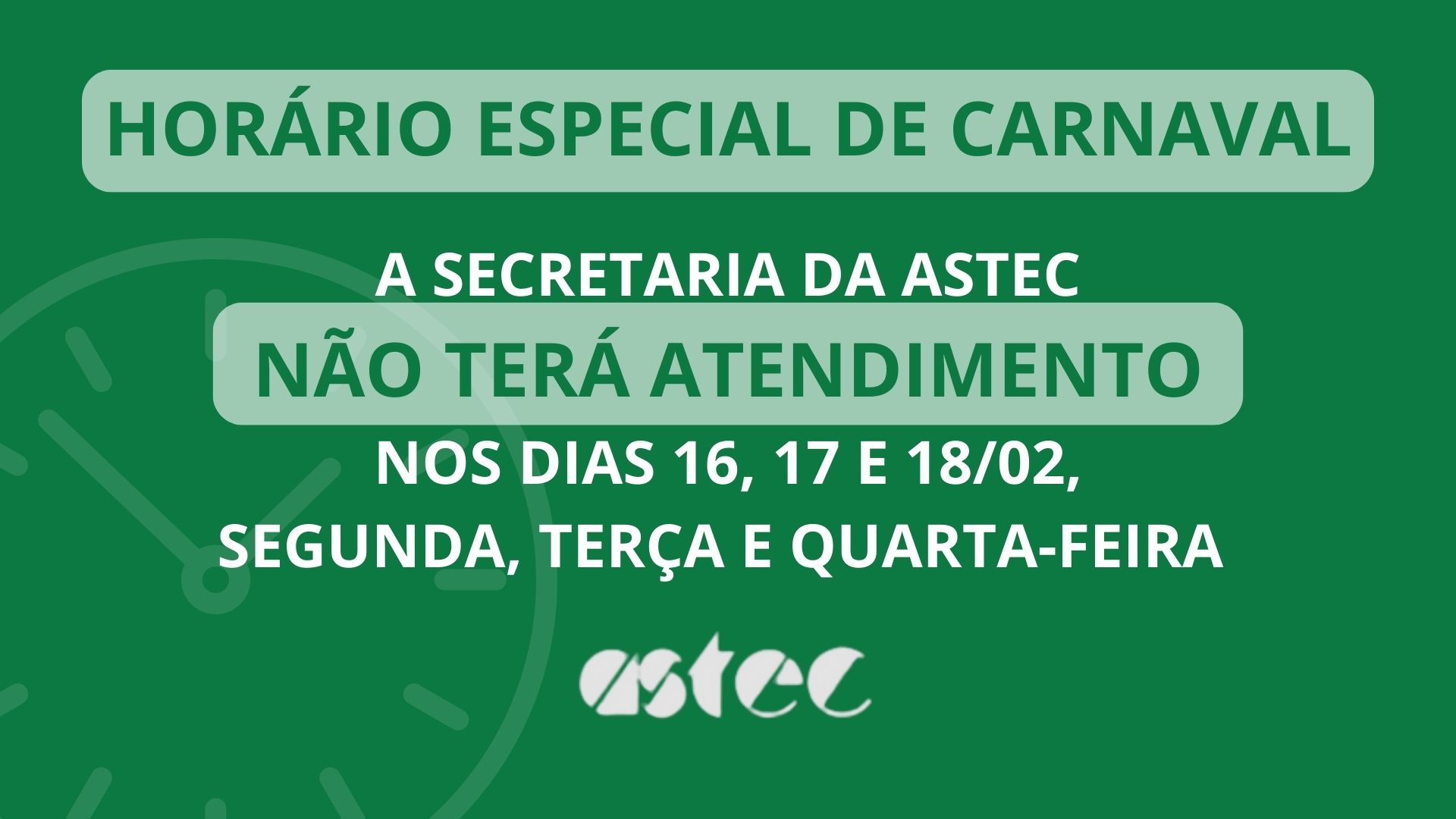 Tendo em vista o período de feriado, NÃO HAVERÁ expediente na secretaria da Astec, nos dias 16, 17 e 18 de fevereiro, segunda e terça-feira de Carnaval e quarta-feira de cinzas.