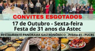 A Festa de Aniversário de 31 anos da Astec já é um grande sucesso! Estão esgotados os convites e há lista de espera para o evento que contará com homenagem aos associados aposentados no período de julho/24 a junho/25. A comemoração será no Restaurante Panorama, prédio 41 da PUCRS, um …
