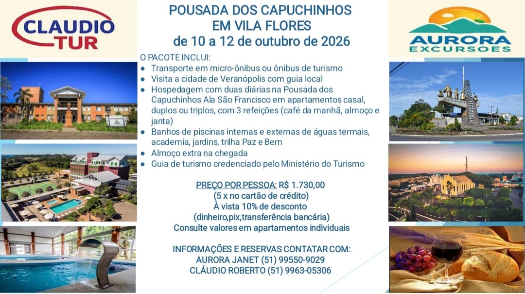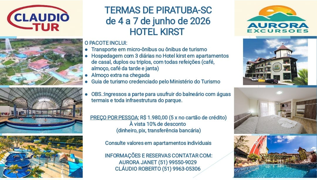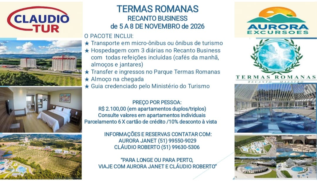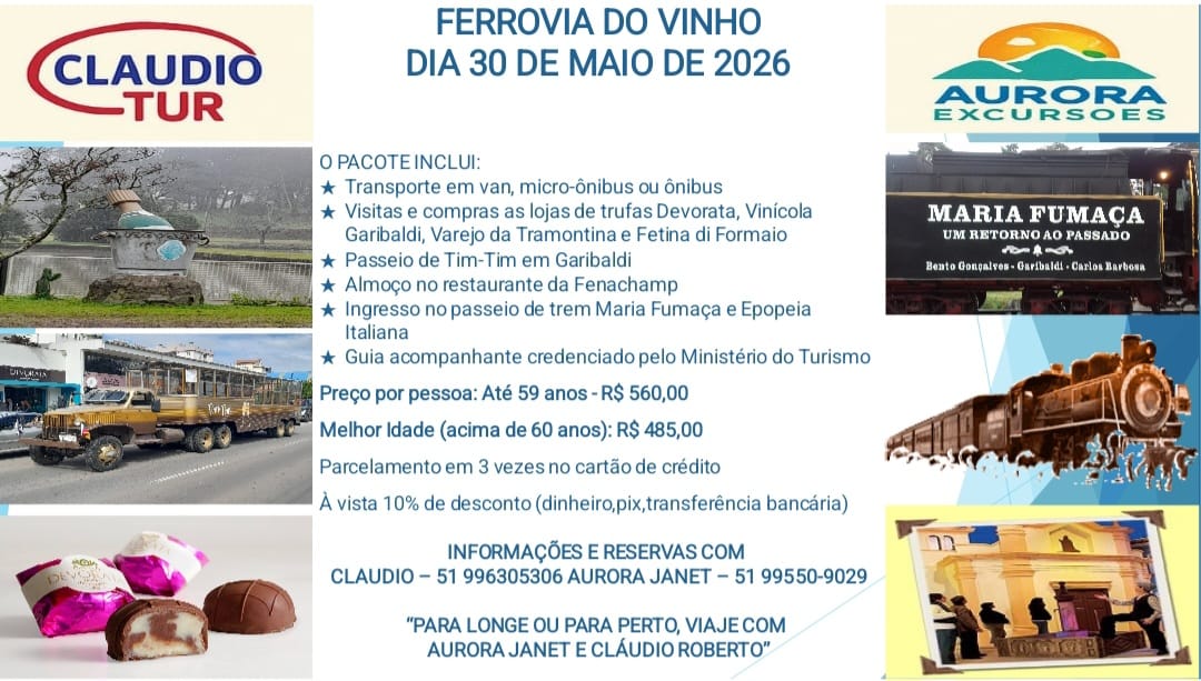 Confira as opções oferecidas, peça assessoria para montar seu próprio roteiro, consultando claudiorobertoturismo.blogspot.com.br ou contate Claudio Roberto pelo celular/whatsappp (51) 99630-5306.