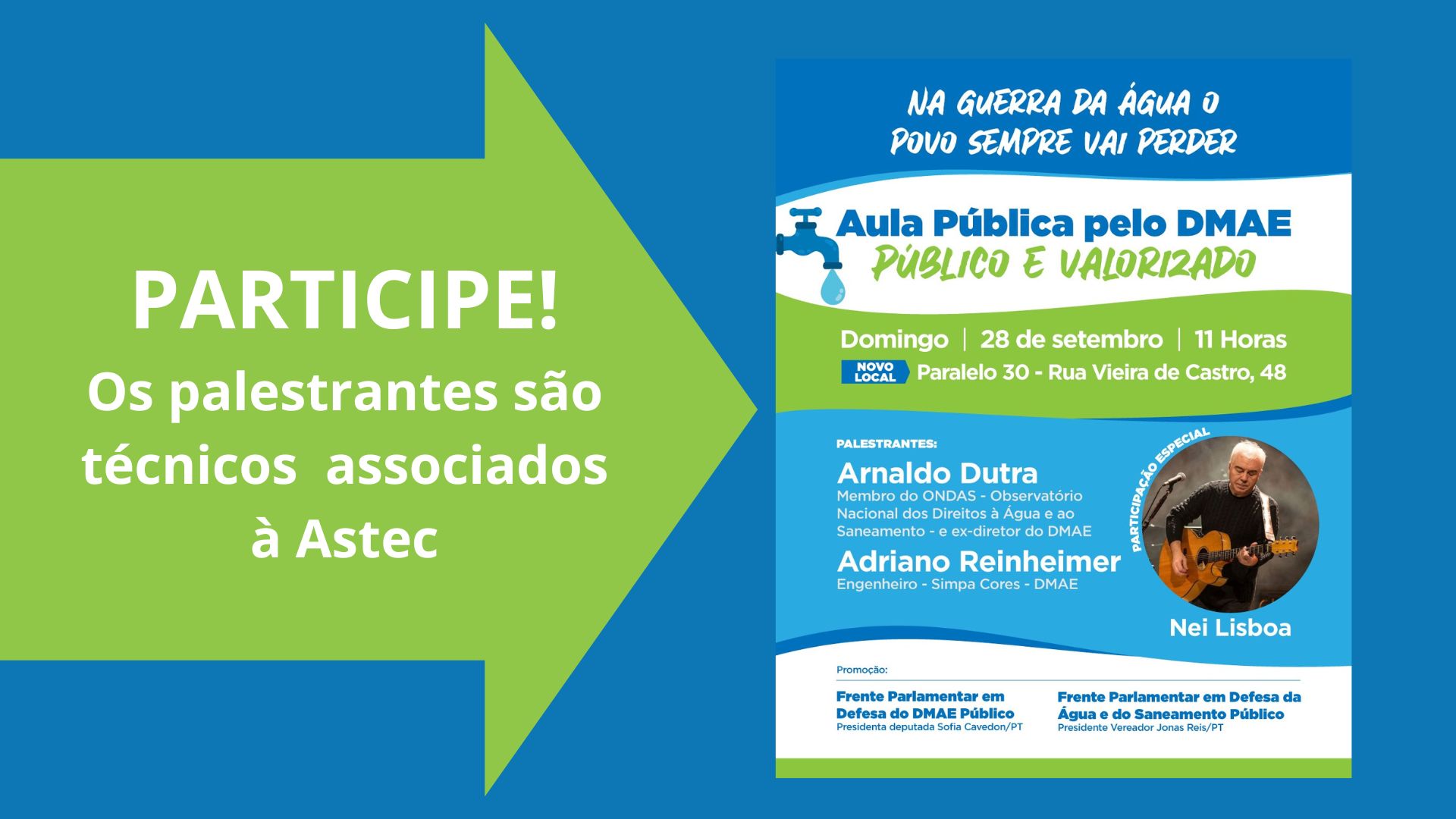 Neste domingo (28/09), a partir das 11h, participe da Aula pública pelo DMAE público e valorizado, no Paralelo 30 (Rua Vieira de Castro, 48 – Cidade Baixa). Os palestrantes serão os associados da Astec, engenheiro Arnaldo Dutra, Membro do Observatório Nacional dos Direitos à Água e ao Saneamento (Ondas) e ex-diretor do DMAE, e engenheiro Adriano Reinheimer, integrante do Simpa Cores-DMAE.