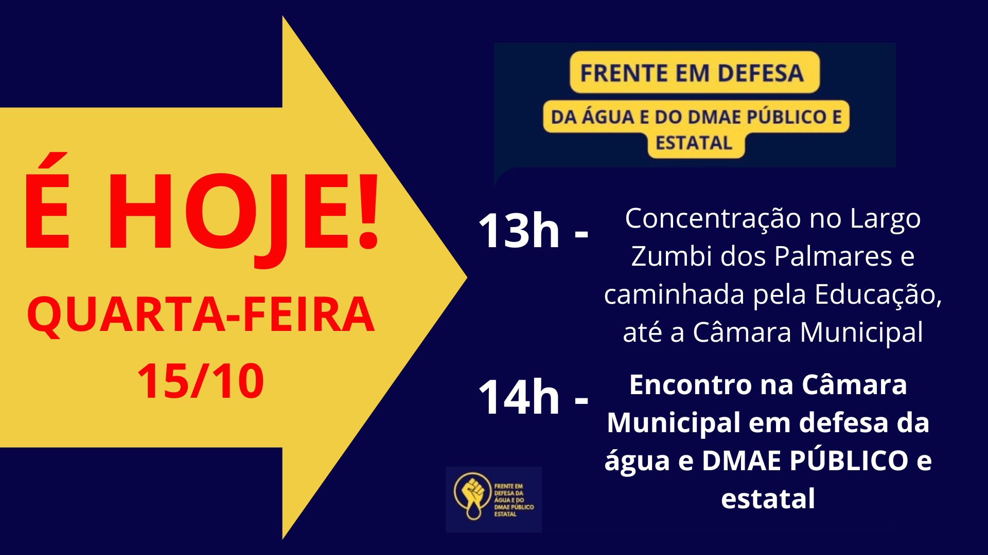 O Projeto de Lei (PL) do governo que quer entregar nossa água às empresas privadas vai à votação HOJE, quarta-feira, 15/10, às 14h. Mas, a programação começa mais cedo, às 13h, em defesa da Educação, com concentração no Largo Zumbi dos Palmares e caminhada até a Câmara Municipal.
