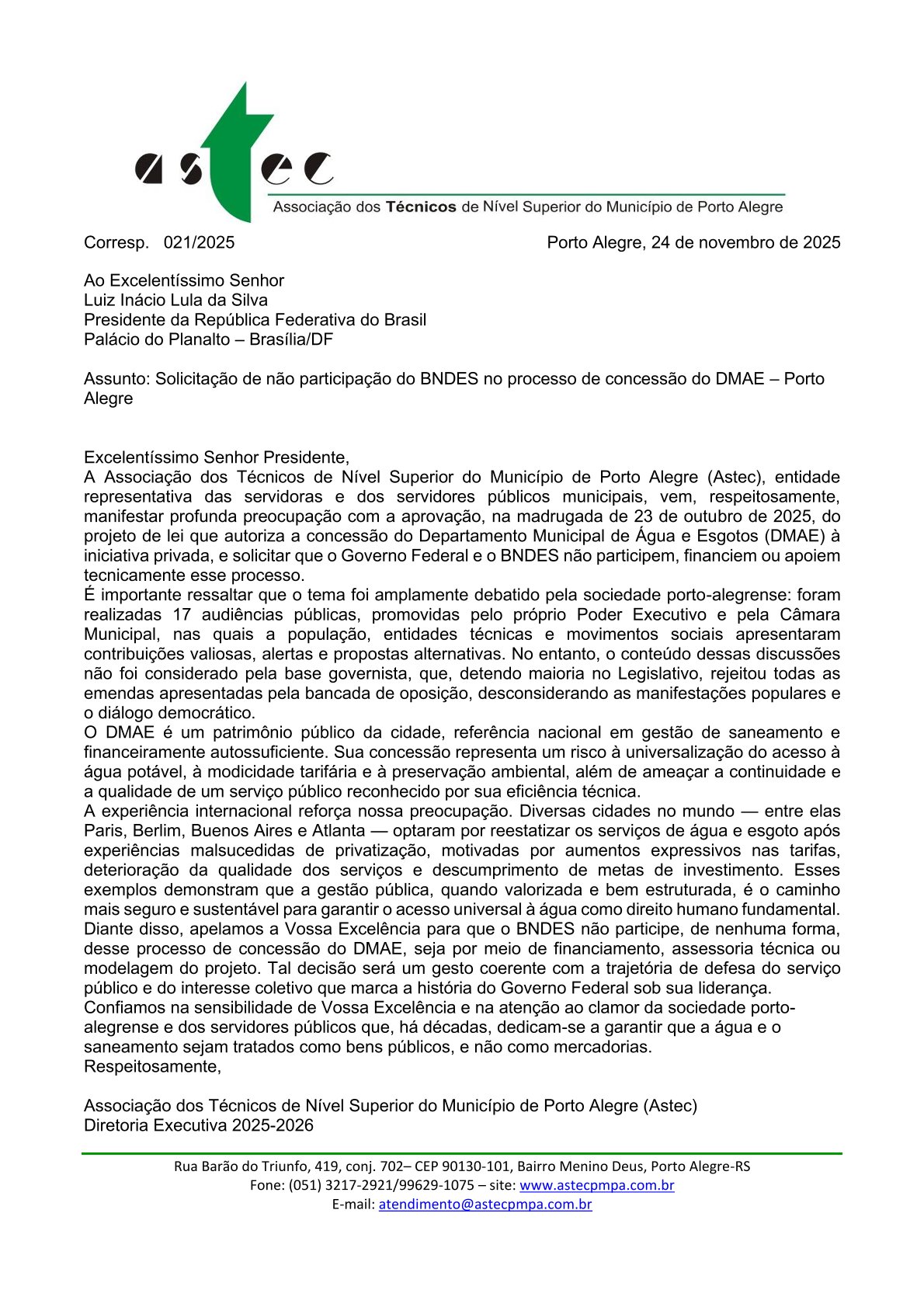 DMAE PÚBLICO E ESTATAL | ASTEC ENVIA CARTA AO PRESIDENTE LULA APELANDO PARA QUE BNDES NÃO PARTICIPE DE CONCESSÃO