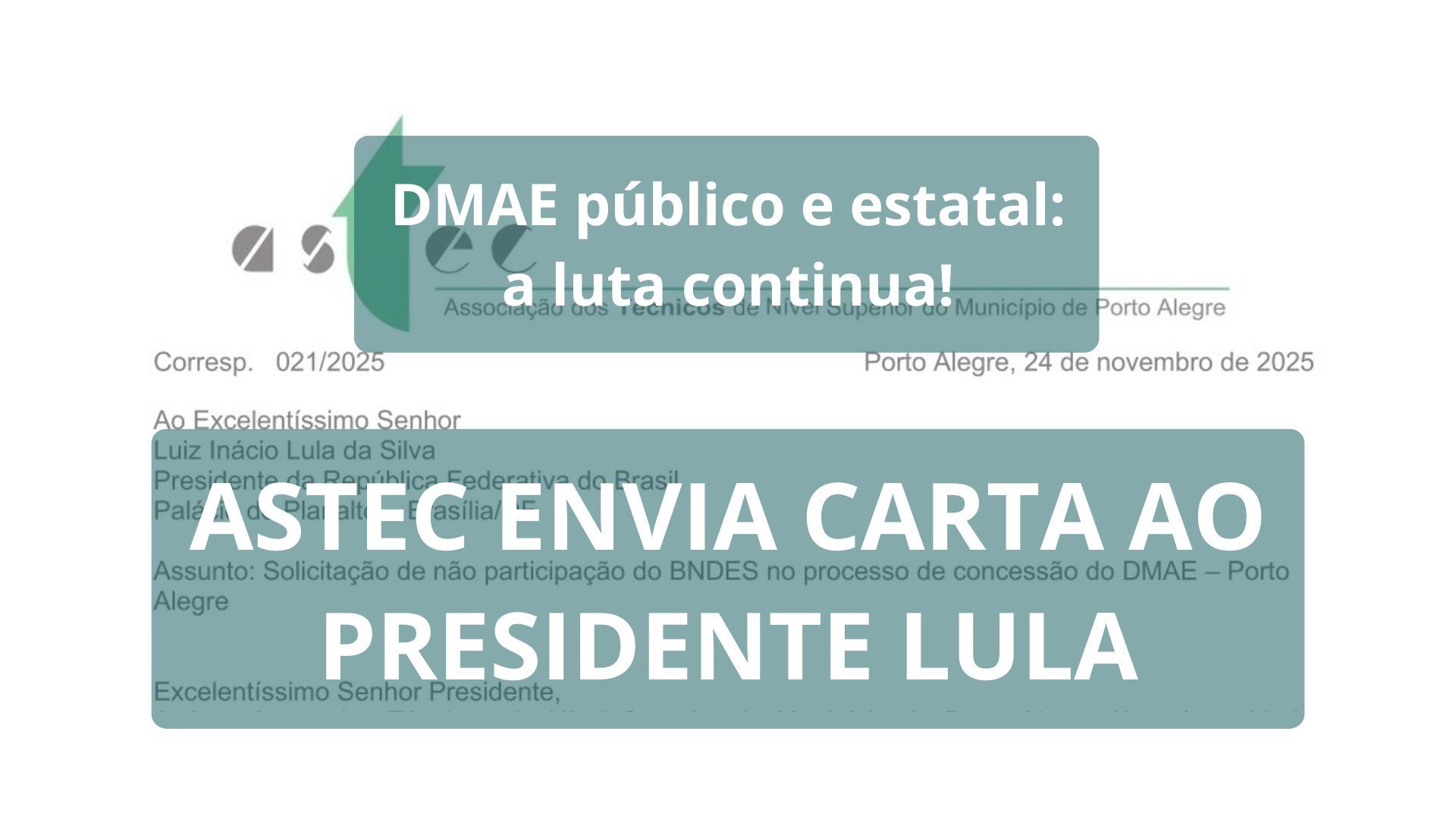 Nesse sentido, além das ações da Frente em Defesa do DMAE Público e Estatal, a Astec encaminhou, na segunda-feira (24/11), carta ao presidente Lula, às bancadas de situação no Senado e na Câmara Federal, assim como para a bancada de oposição na Assembleia Legislativa do Estado, além de outras autoridades, como a presidenta do Banco do BRICS, Dilma Roussef. No texto, a entidade apela que o BNDES não participe, de nenhuma forma, do processo de concessão da autarquia. O objetivo: prosseguirmos lutando pela manutenção do DMAE público e estatal, um patrimônio de toda a população porto-alegrense.