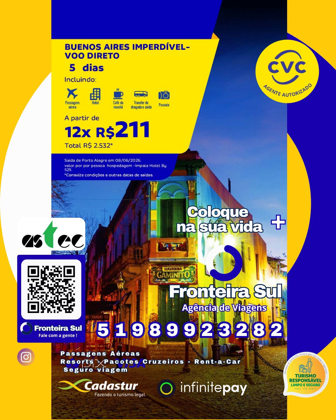 A Fronteira Sul Agência de Viagens apresenta uma excelente oportunidade para associados e associadas da ASTEC vivenciarem uma experiência internacional completa na encantadora Buenos Aires, reconhecida por sua rica cultura, gastronomia e arquitetura europeia.