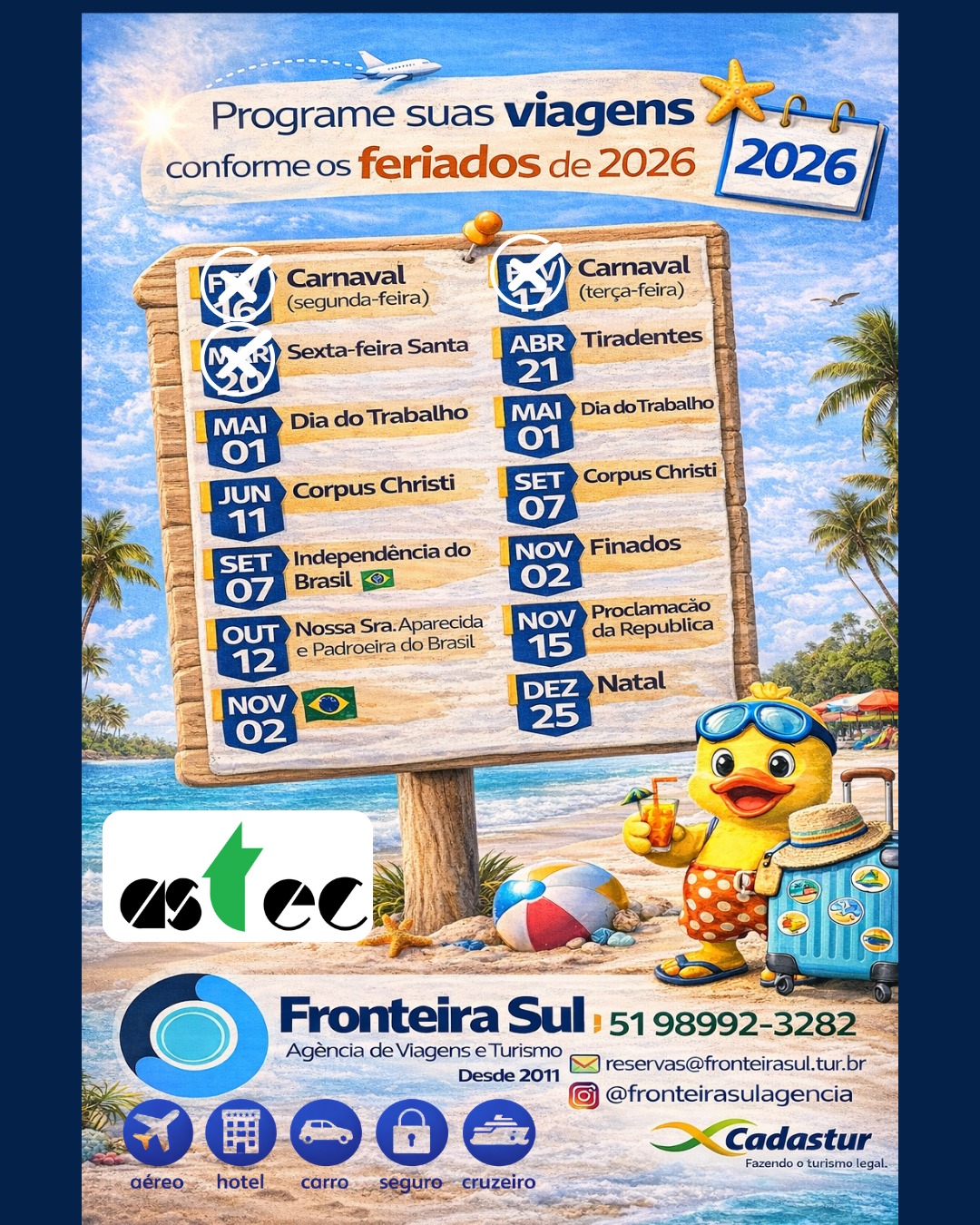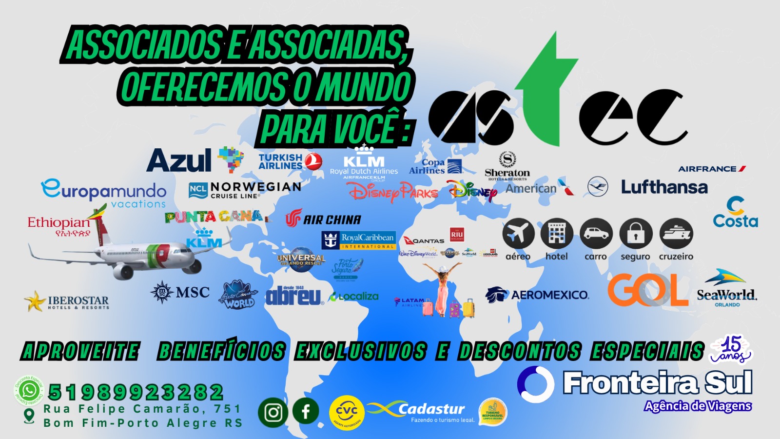 Conheça a parceria firmada entre a Astec e a Fronteira Sul Viagens e Turismo, empresa com mais de 15 anos de experiência no mercado turístico. A partir desta parceria, todas as associadas e associados passam a contar com condições especiais, descontos exclusivos e atendimento diferenciado para planejar suas viagens nacionais e internacionais com mais tranquilidade, economia e segurança.