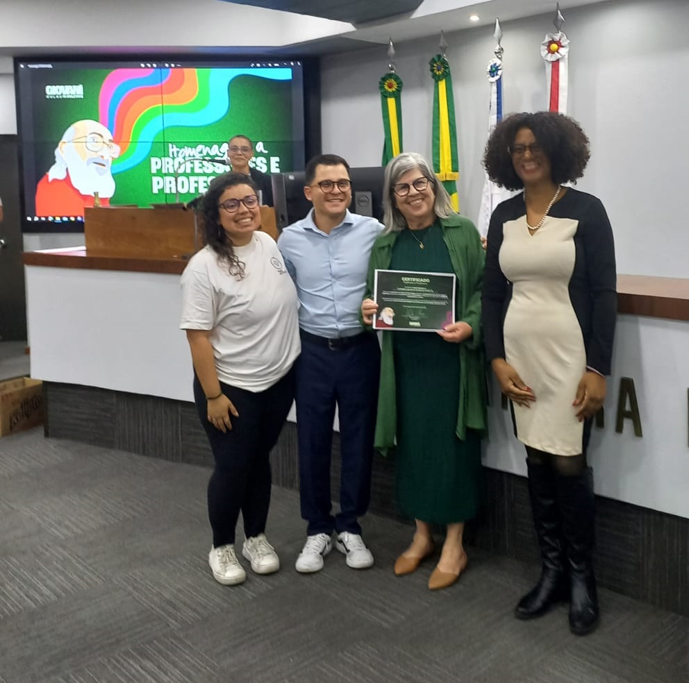 Na noite da segunda-feira, 03/10, a professora Carmen Padilha, presidente da Astec, foi uma das homenageadas pelo mandato do vereador Giovani Culau e Coletivo (PCdoB).