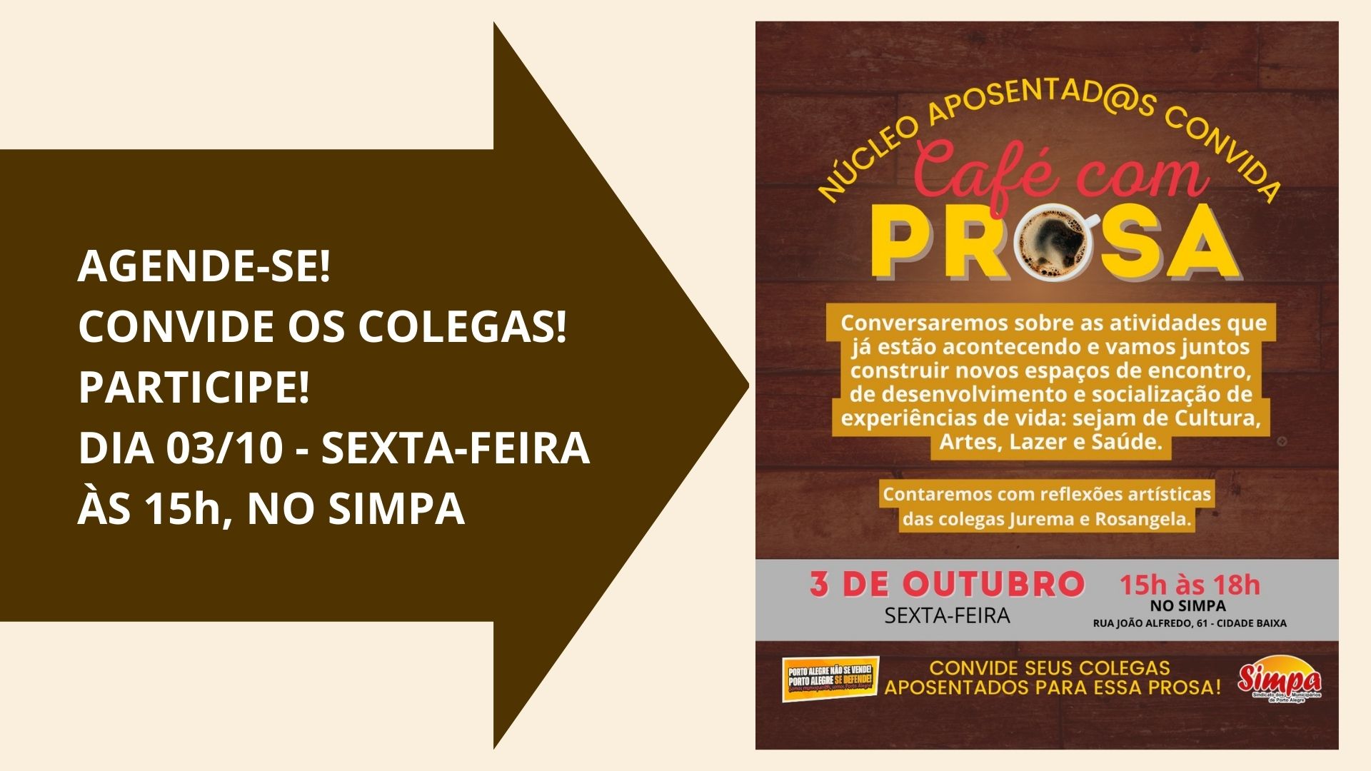 Convidamos tod@s @s colegas municipári@s aposentad@s para nosso 3° Café com Prosa, que acontecerá no próximo dia 03 de outubro, sexta-feira, às 15h, na sede do Simpa.